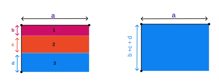 The diagram above illustrates the mentioned proposition, on how the sum of the areas of labeled rectangles equals the area of the rectangle on the right. In Algebra, this translates to the distributive property, which states that a (b + c + d) = ab + ac + ad. Similarly, fundamental Algebraic laws such as the commutative and associative laws find their origins in Geometry.