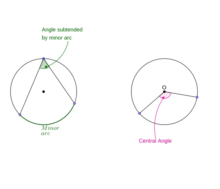 Furthermore, there are two types of angles you can find in circle theorems: the subtended angle, and the central angle. The subtended angle is formed when two chords meet at a point on the circumference. The central angle is self-explanatory, forming at the center of the circle from two radii.