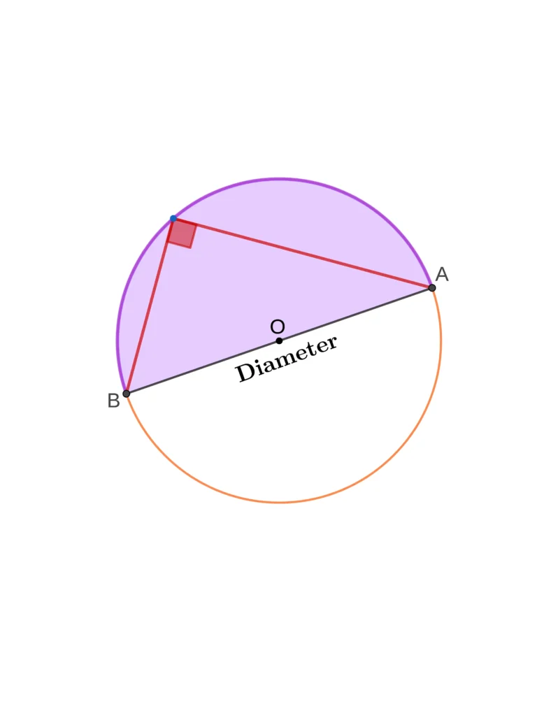 This theorem states that an angle in a semicircle is always 90 degrees or a right angle. Another way to understand this is that the angle formed by the diameter at any point on the circumference is a right angle.